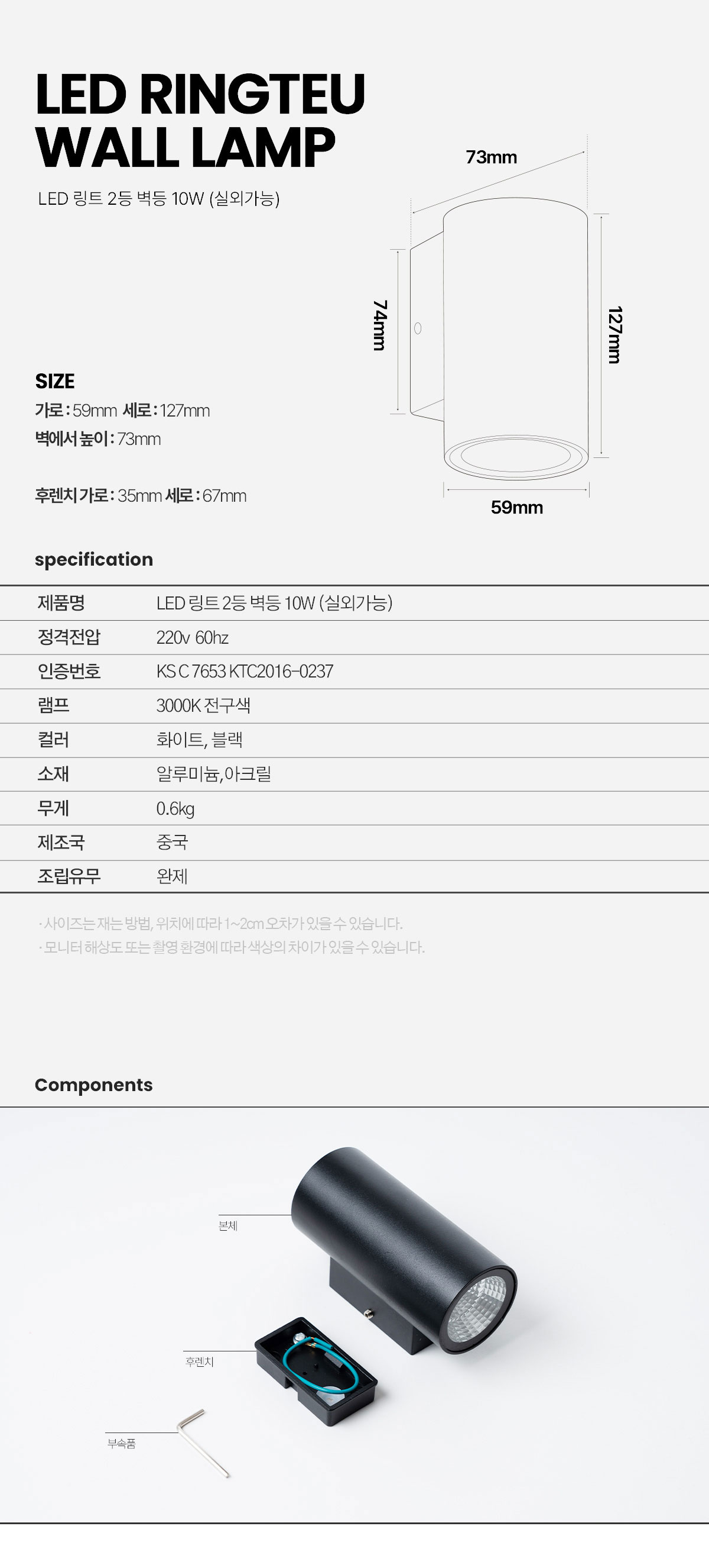 LED 링트 2등 벽등 10W (실외가능)