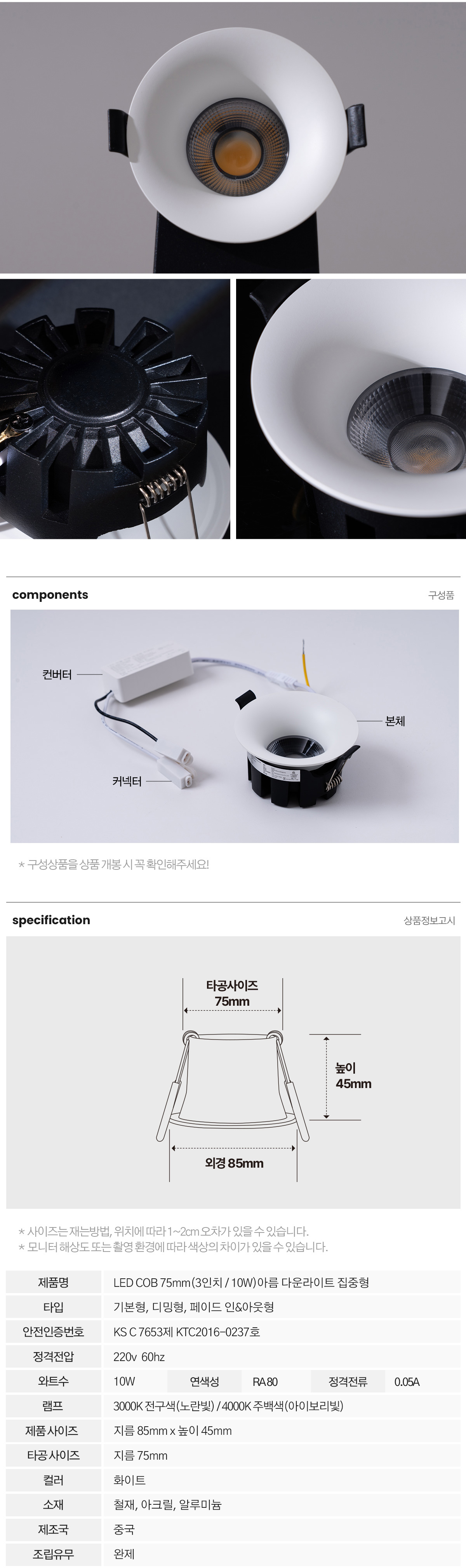 LED COB 3인치 아름 다운라이트 10W 집중형